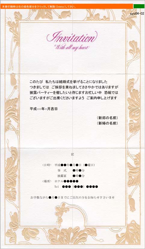 注:こちらは、三つ折の表紙に直接印刷する「ブリリアント招待状三つ折」用のテンプレートです。 |