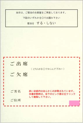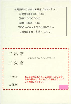 はがき裏面の出欠確認部分(赤い点線内)は、あらかじめ印刷されています。